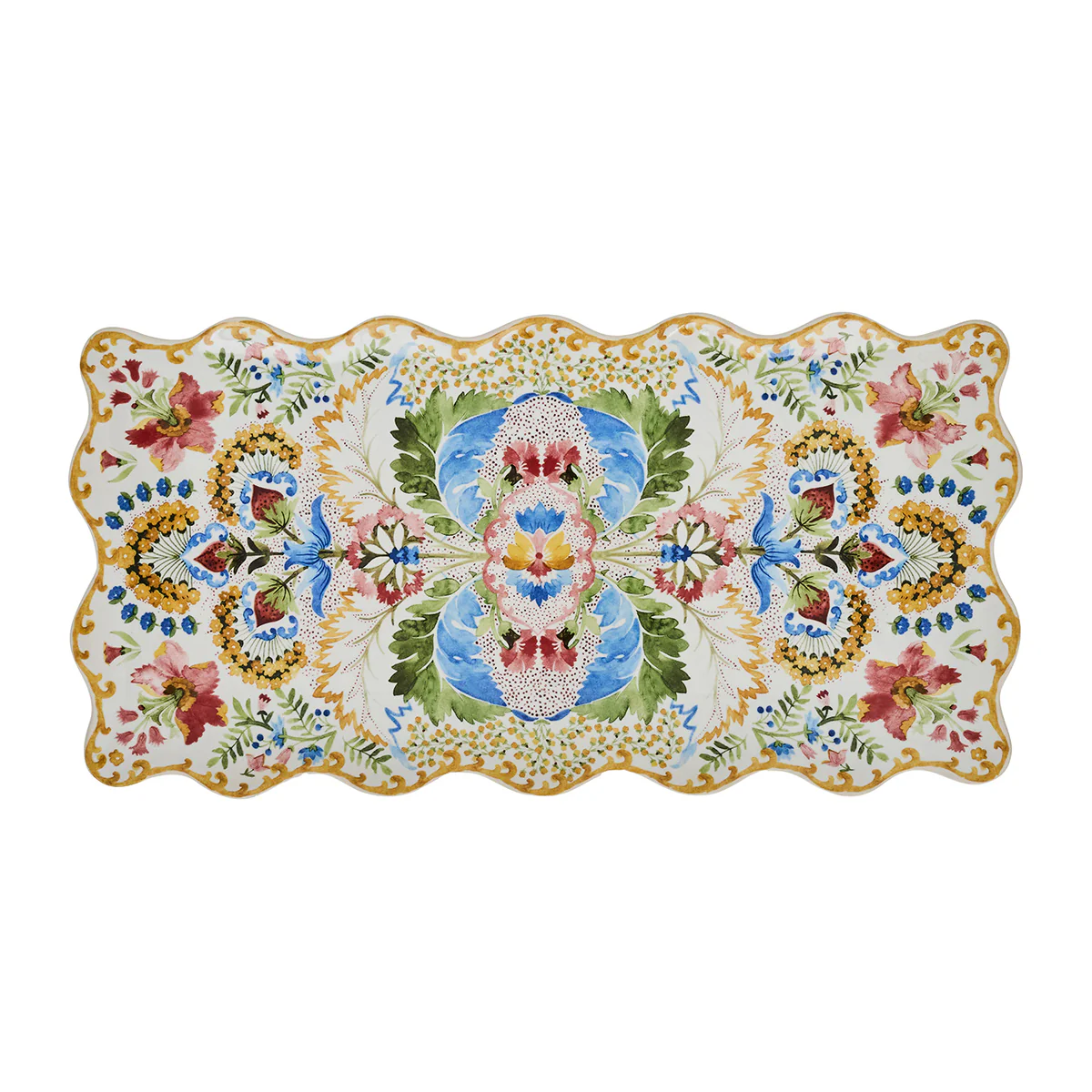 Rimmed with a romantic, ruffled silhouette and festooned with a fantasy floral motif in a painterly palette of petal pinks, garden greens, iris blues, and daffodil yellows, this versatile platter makes serving up everything—from charcuterie to dessert—a delicious work of art.